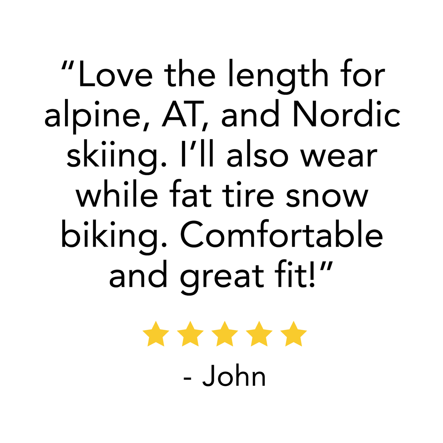 Ski and snowboard boots don't play nice with full-length base layers. The fabric bunches, the bulk builds, and your boot fit suffers. These 3/4 bottoms solve the problem—ending above your boot top where they meet your over-the-calf ski socks. Zero bulk, zero bunching, zero compromise on warmth.